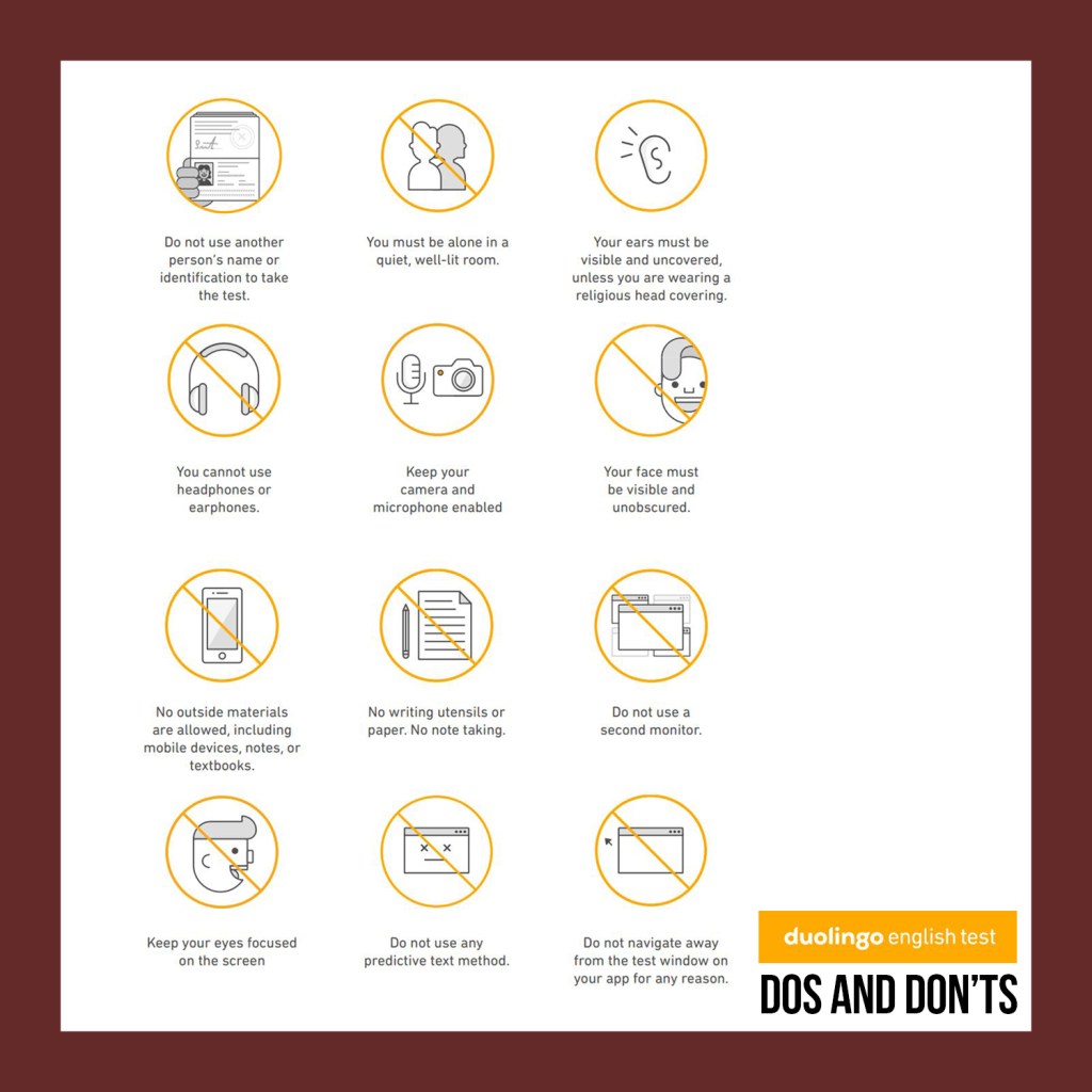 ဖြေဆိုသူတိုင်းအတွက် Dos and Don’ts အသေးစိတ်နဲ့ Duolingo English Test ရဲ့ question types တွေအကြောင်းကို Official guide pdf ထဲမှာသေချာပြောပြထားပါတယ်။ ဖြေဆိုမယ့်သူတိုင်း ဒီ guide book ကို ကြိုတင်ဖတ်ထားစေချင်ပါတယ်။